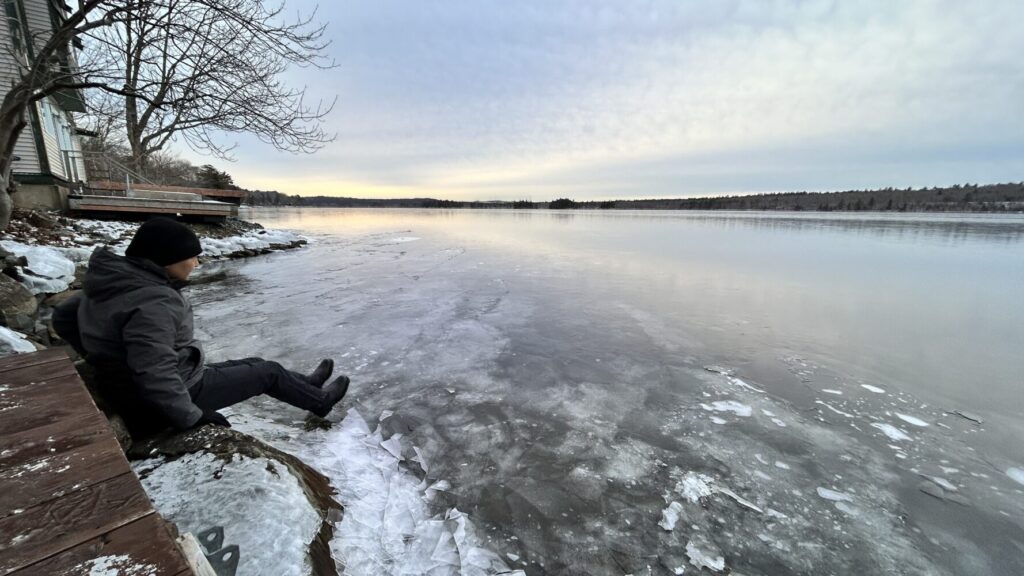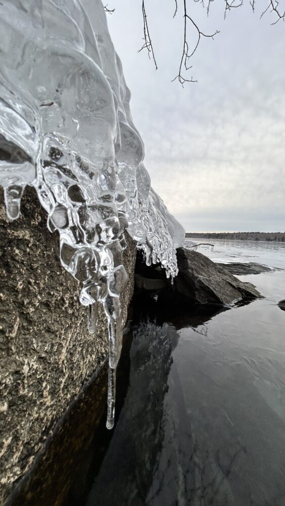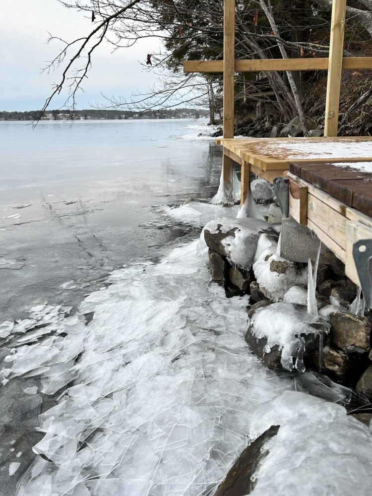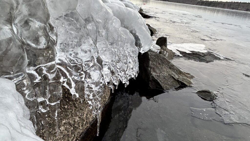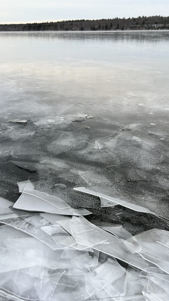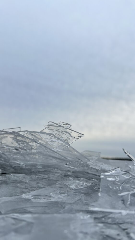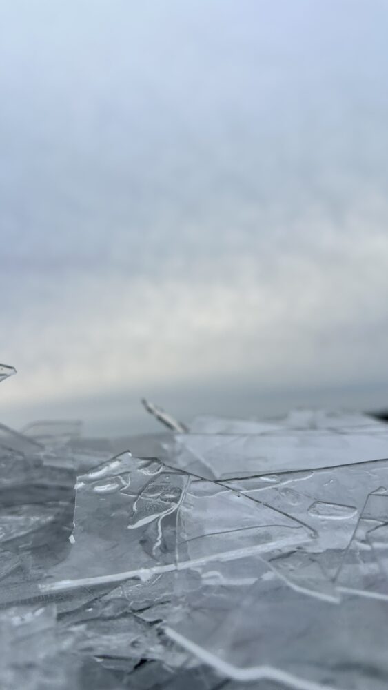 Freezing rain fell as the ice covering the lake slowly pressed toward the shore, thin sheets overlapping and catching the light with a quiet, icy beauty.