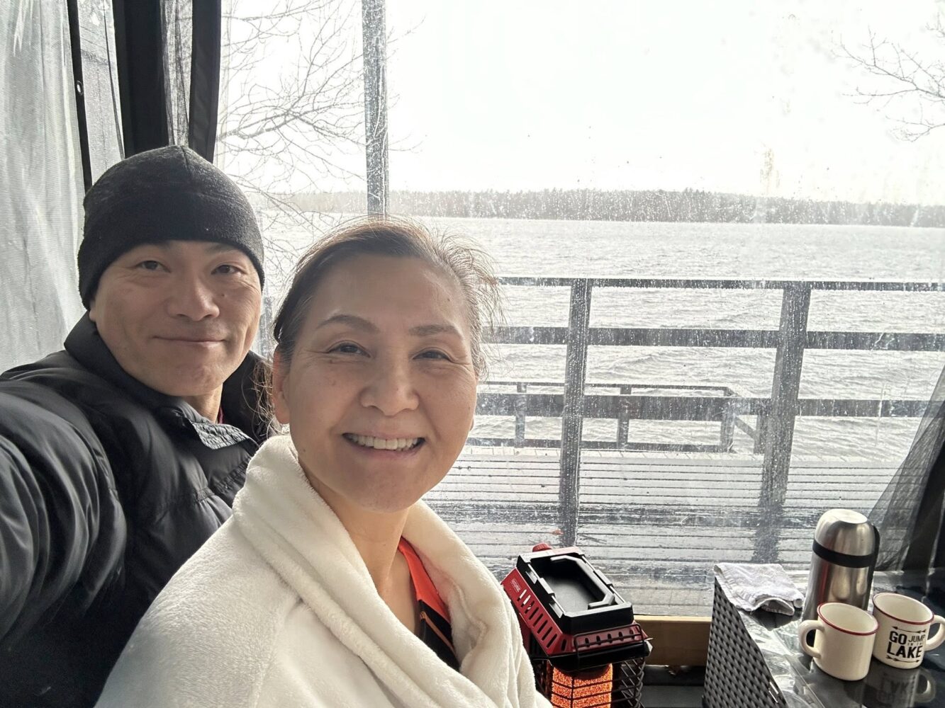 Early in the morning, everything was blanketed in white, and even the water’s edge was frozen solid. By noon, the weather had shifted—rain began to fall, and the temperature crept up.